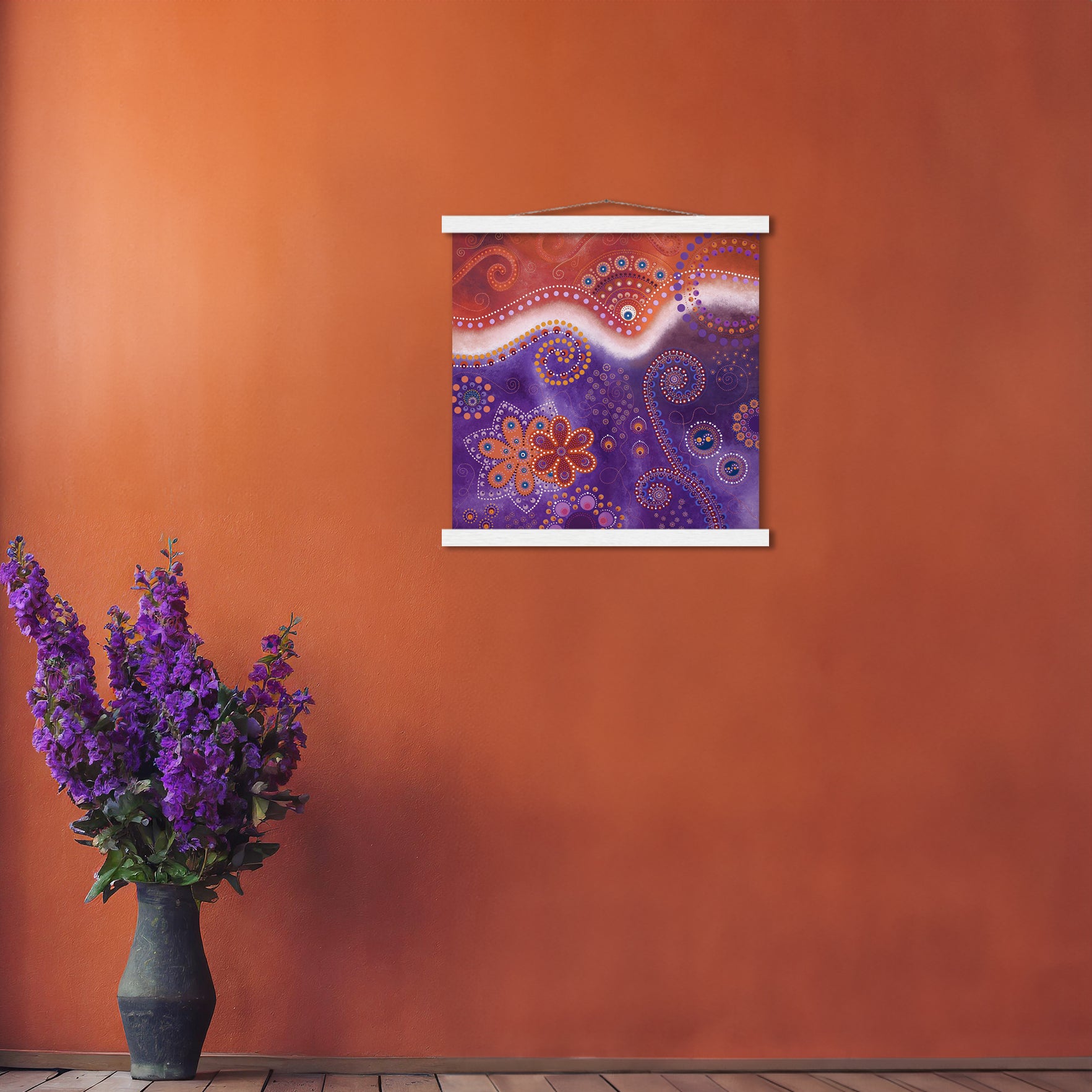 - A high-quality print with a beautiful hanger. Each hanger includes four wooden sticks, two that clamp the top of your print and two that clamp the bottom, and cotton ropes that match the hanger color. Strong magnets securely grip your artwork, and also making it possible for you to change the art if you want.