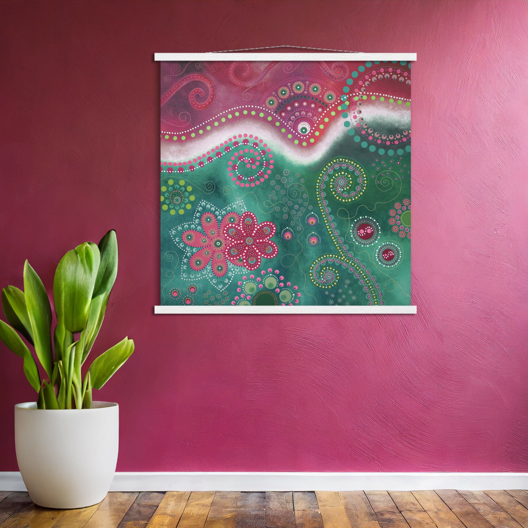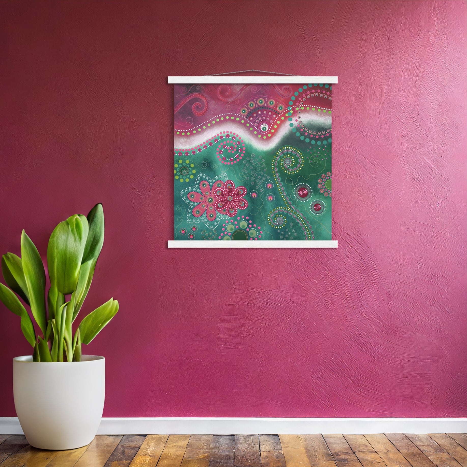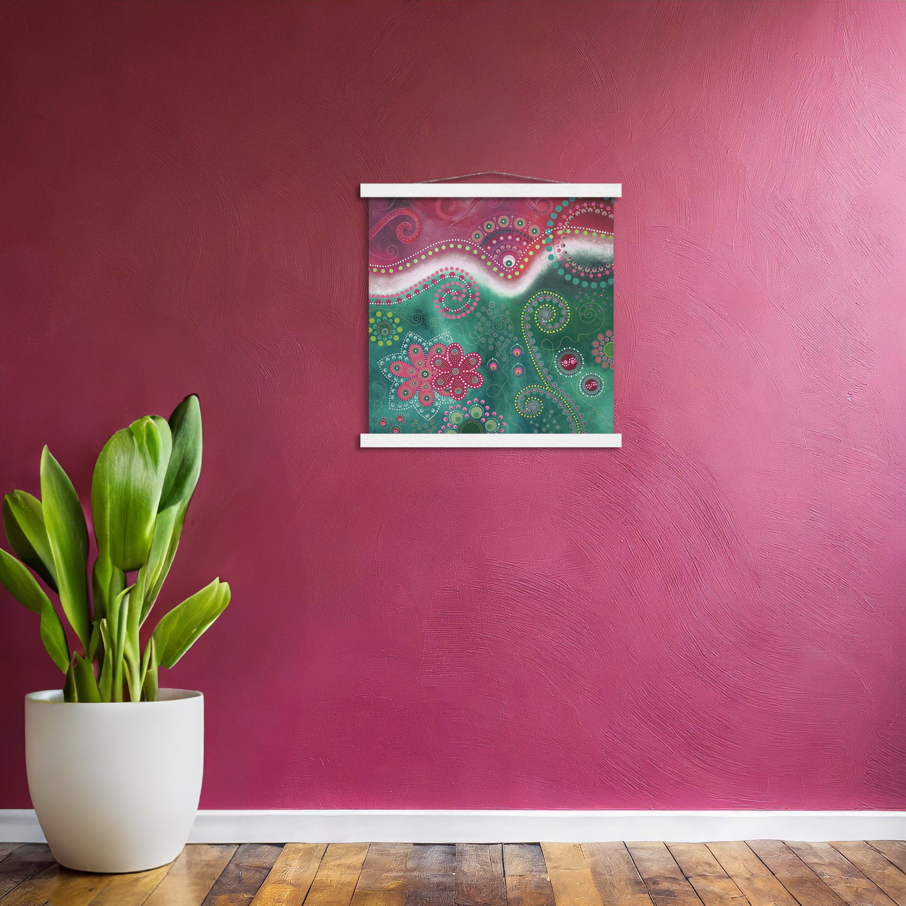 - A high-quality print with a beautiful hanger. Each hanger includes four wooden sticks, two that clamp the top of your print and two that clamp the bottom, and cotton ropes that match the hanger color. Strong magnets securely grip your artwork, and also making it possible for you to change the art if you want.