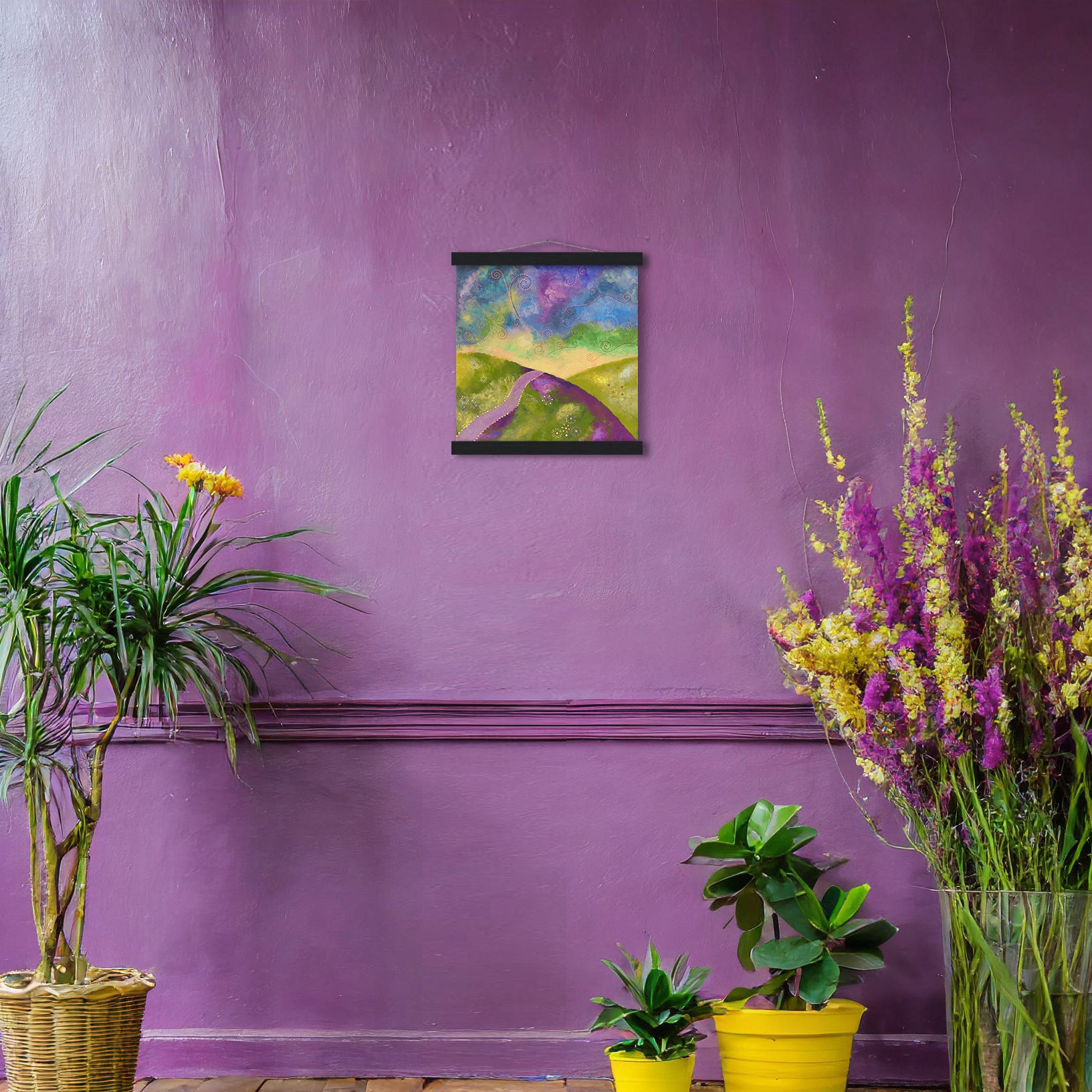 - A high-quality print with a beautiful hanger. Each hanger includes four wooden sticks, two that clamp the top of your print and two that clamp the bottom, and cotton ropes that match the hanger color. Strong magnets securely grip your artwork, and also making it possible for you to change the art if you want.